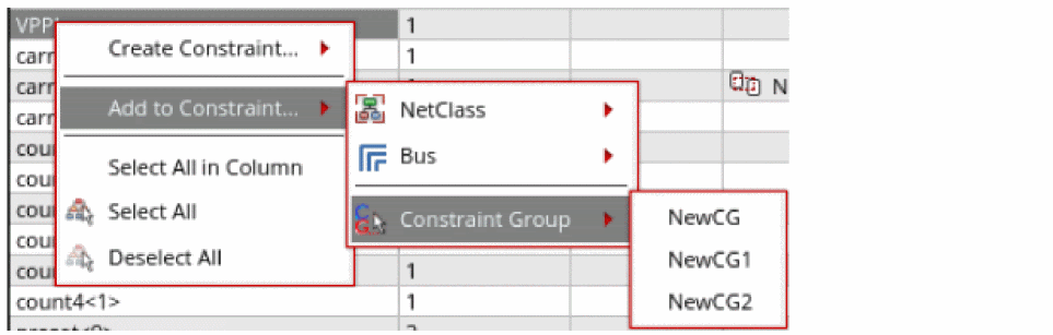Right-click the constraint group name in the Process Rule Overrides column next to the net name that you want to remove from the group.
