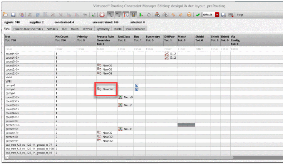 The name of the constraint group appears in the Process Rule Overrides column for the selected net.