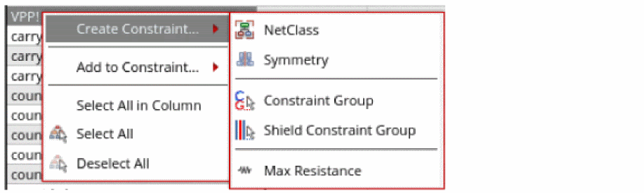 Alternatively, right-click a net in the Nets column of the constraints table.