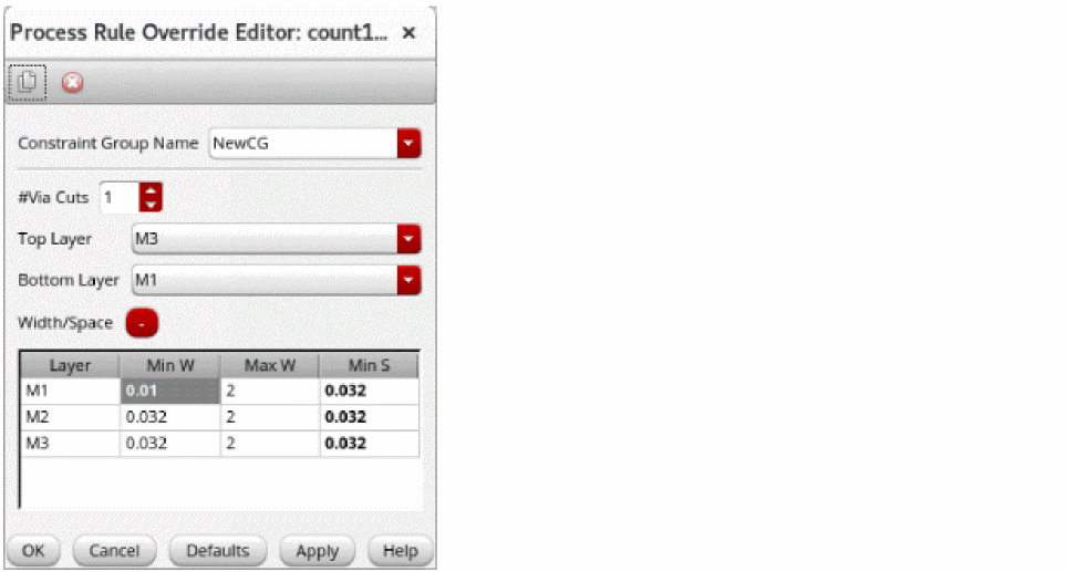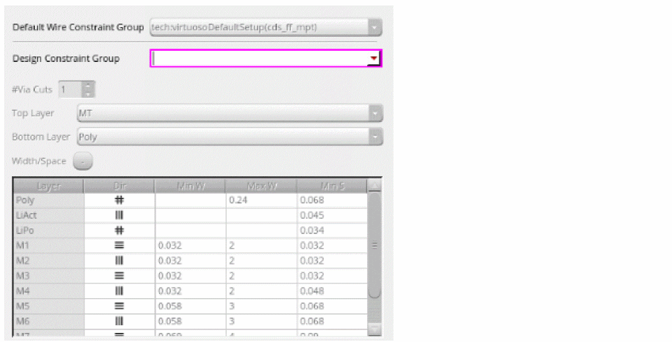 - Double-click and change the width value of a metal layer. After changing the value, the color of the cell changes for the modified value. This color change reflects the change from the default value.