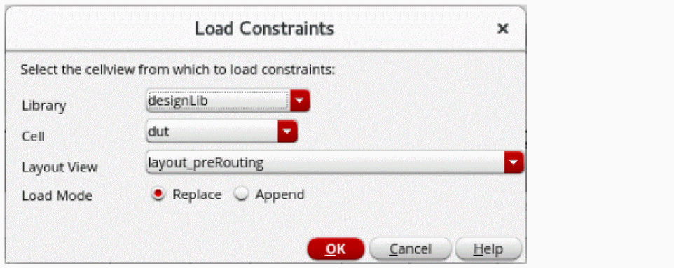 Routing Constraint Manager lets you load constraints from the specified library:cell:view. To load constraints: