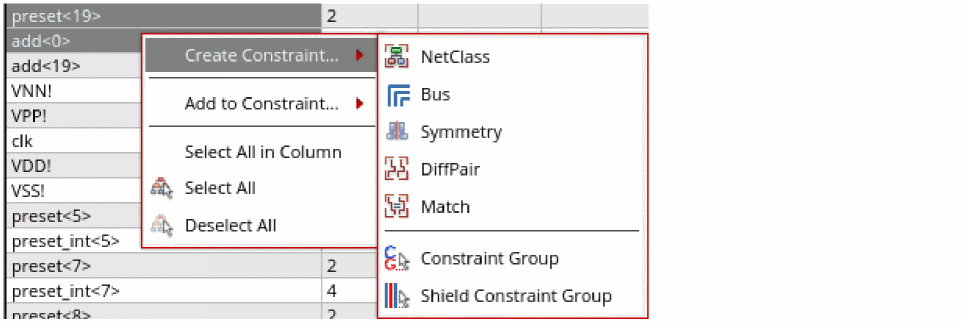- Click the constraint name that you want to create. For example, to create the netclass constraint, click NetClass.