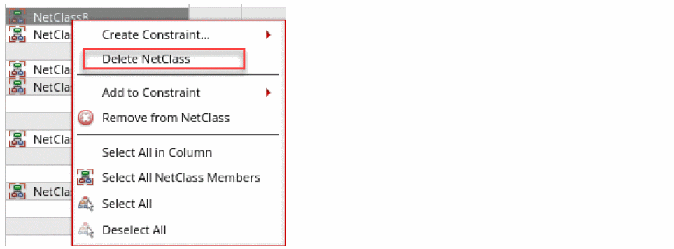 Click Delete <constraint name>. For example, to delete a NetClass constraint, click Delete NetClass.