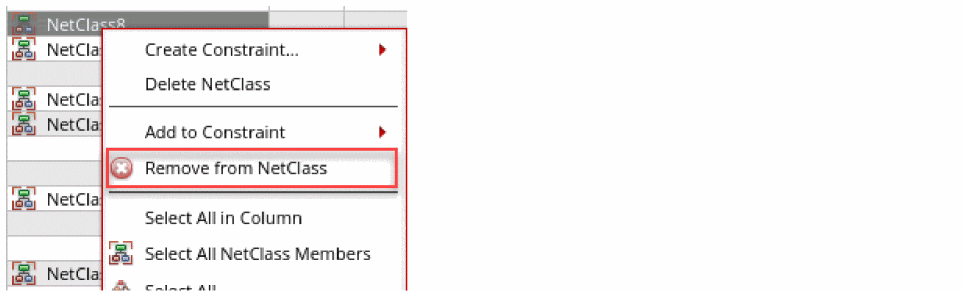 Click Remove from <constraint name>. For example, to remove a net from the NetClass constraint, click Remove from NetClass.