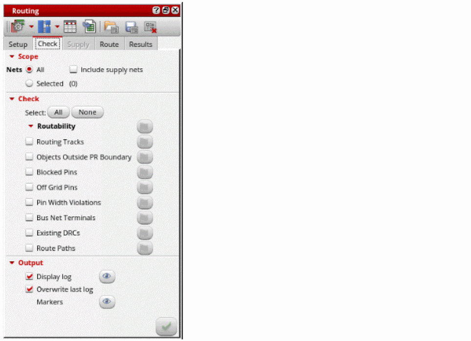 - Deselect the Routing Tracks and Existing DRCs checks.