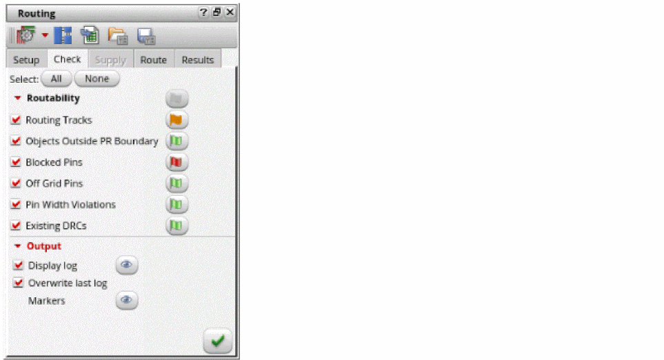 Afteryou have run the checks, the status flags appear in green, orange, and red colors. A green flag indicates that the check was passed, orange indicates a warning, and red indicates an error. Ensure that no red flags appear. This means that the design is routable.