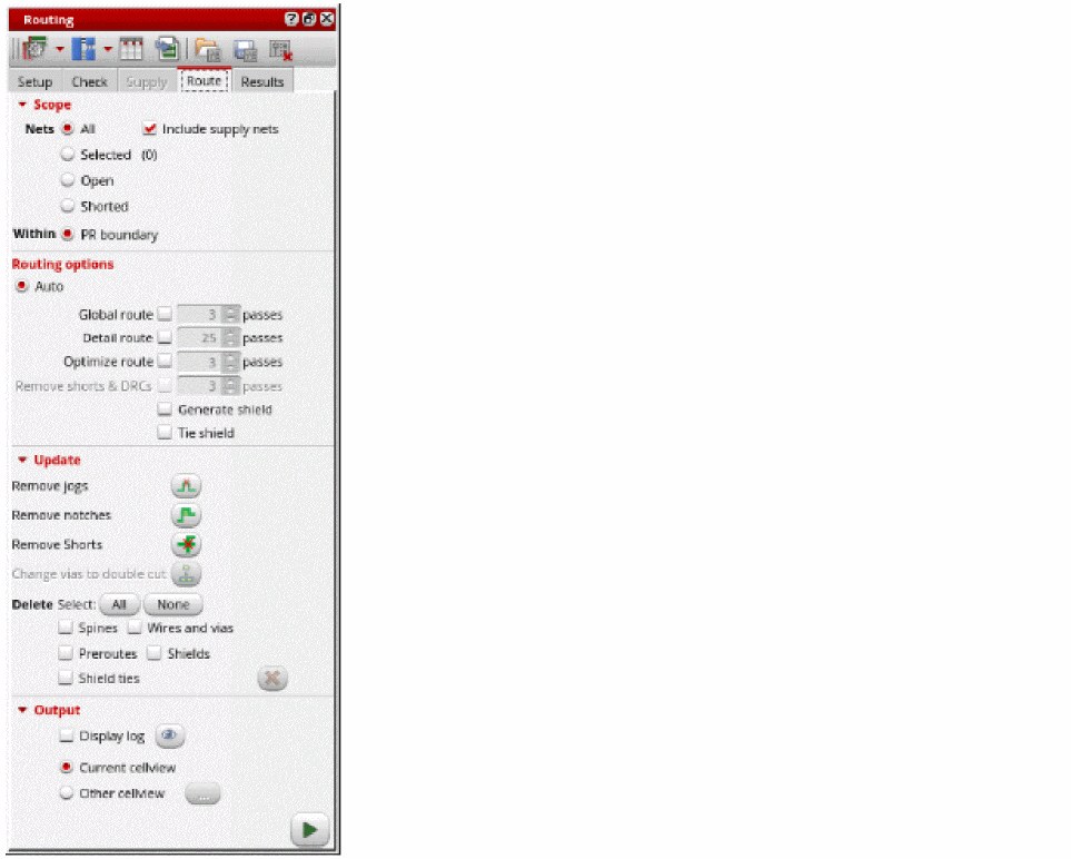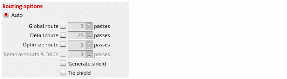 - Select Generate shield in the Routing options section. If the option is unselected, the shielding wires can still be routed as a post-route process. In such case, the router takes care of the extra spacing required by the shielding while routing the regular nets.