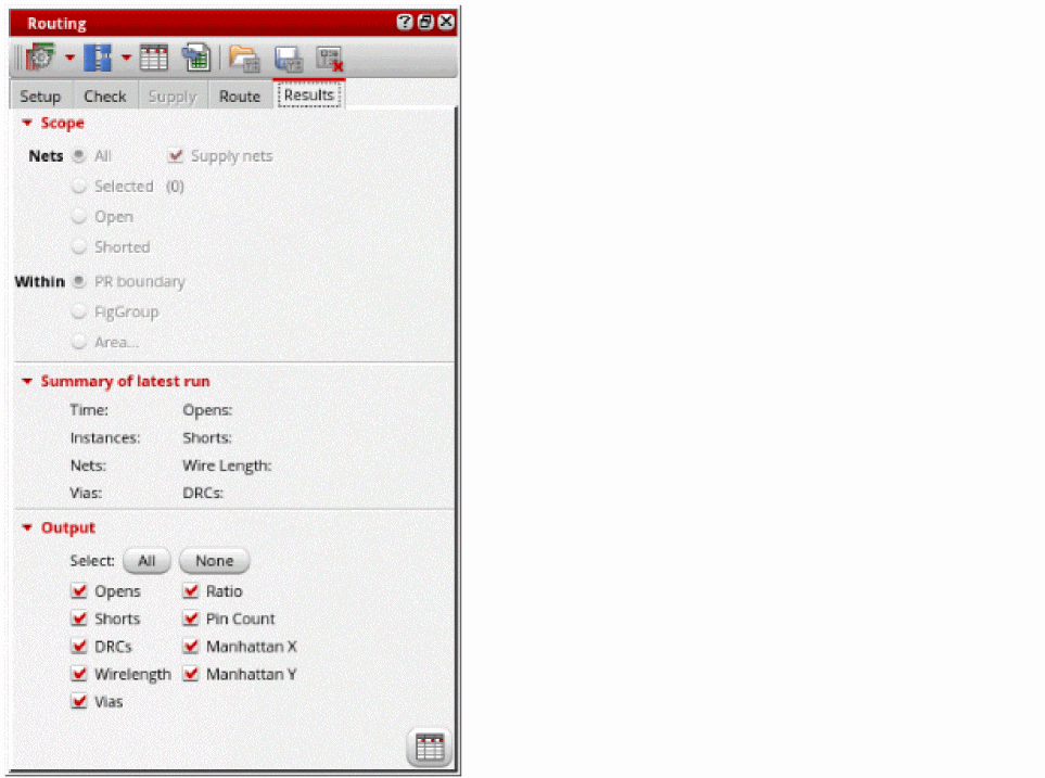 - Select All in the Output section. You can also select one or more outputs by clicking the check box next to the output name. The selected output name column is displayed in the Routing Results Browser.