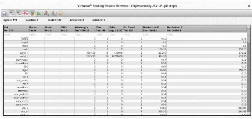 Click on the Results Browser button at the bottom right corner. The Routing Results Browser displays. You can see the total number of routed nets, opens, shorts and the details of various violations.