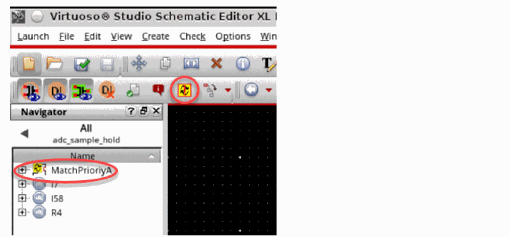 It is possible to preview an alert for sync required on design intents without having the need of schematic and layout views to be opened together. This means that you can preview sync required on design intents with only schematic view opened. To preview the design intents that have a sync required alert on them, use the Check and Save button on the toolbar. With the use of Check and Save, the design intent that has a sync required gets an icon for pending sync in the navigator and on toolbar, as shown in the following figure.
