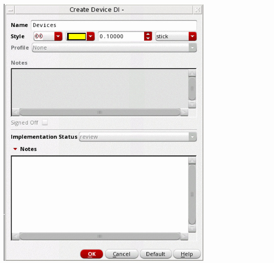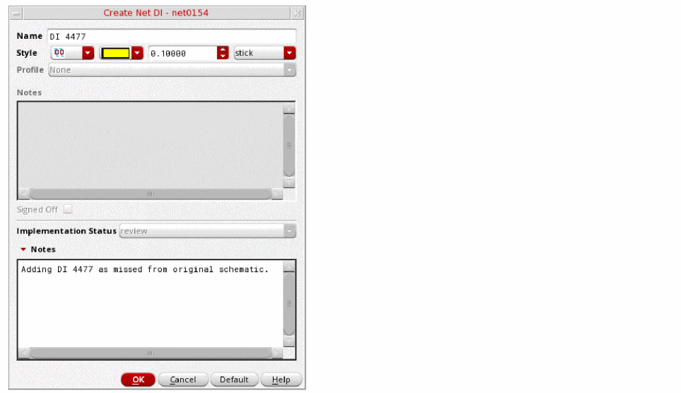 In the lower section Notes, add any information regarding the implementation and the purpose of the design intent for the schematic designer. The Notes in the upper section of the form are unavailable. An Implementation Status of