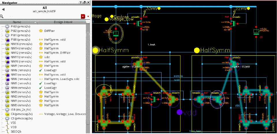 Selecting a design intent or object in the Navigator or on the canvas or hovering on a glyph halos its members in the Navigator and on the canvas in Schematics XL and Layout XL, and in the Constraint Manager assistant in Layout XL.