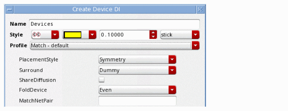 The Match – default profile comprises the properties PlacementStyle, Surround, ShareDiffusion, FoldDevice, and MatchNetPair.