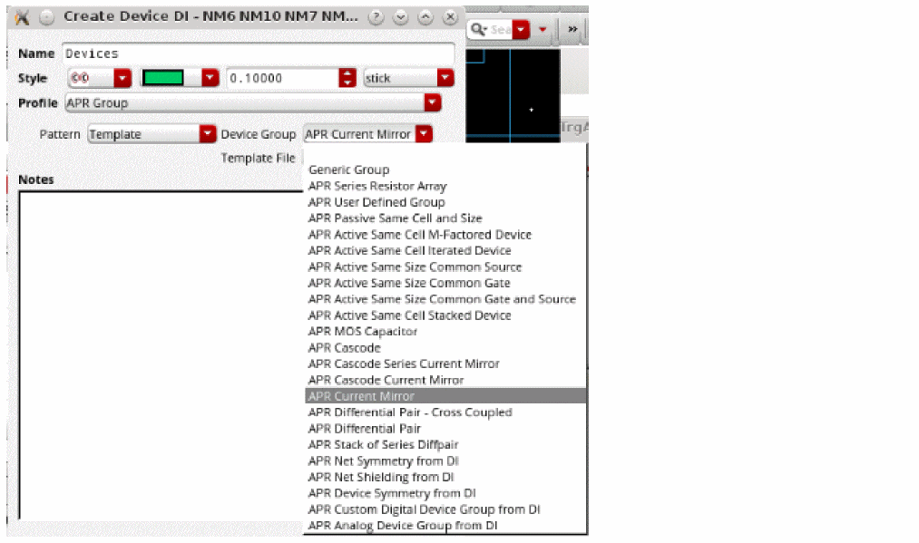 You can also specify the APR finder for device group. This can be applied when used in layout with APR flow. In addition, there is a provision to include an existing template file to reuse the configuration.