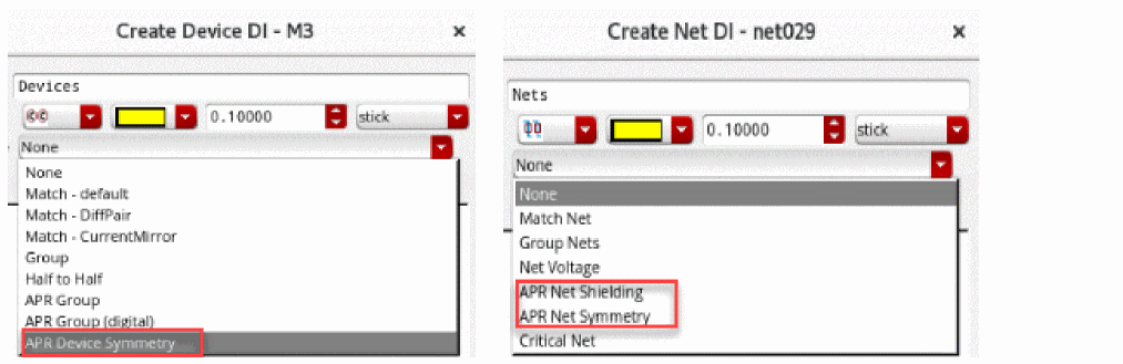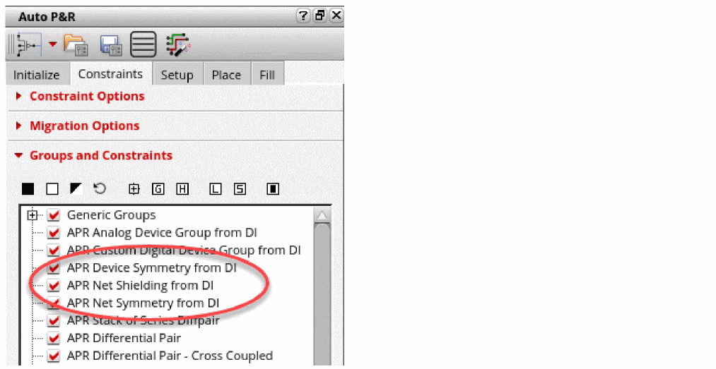 The automatic placement and routing flow in layout can search for the design intents with APR profile defined on them to create right set of constraints.