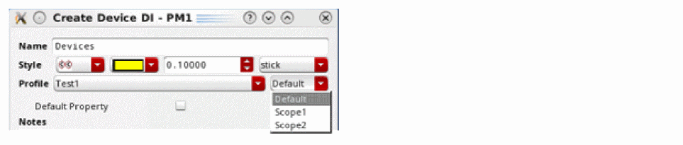 scopesattribute to the property definition. For its value, add the name of the scope to be associated with the property. For example: "Scope1,Scope2".(ciSetDIPropertyGroupDefs '( (nil name "Profile1" category "Devices" properties ((nil name "DefaultProp" type bool guiName "Default Property" defValue nil) (nil name "Group1Prop1" scopes list("Devices" "Macro) type bool defValue nil) (nil name "Group2Prop1" scopes "Scope2" guiName "Group2 Prop1” type bool defValue nil)) ) ) )