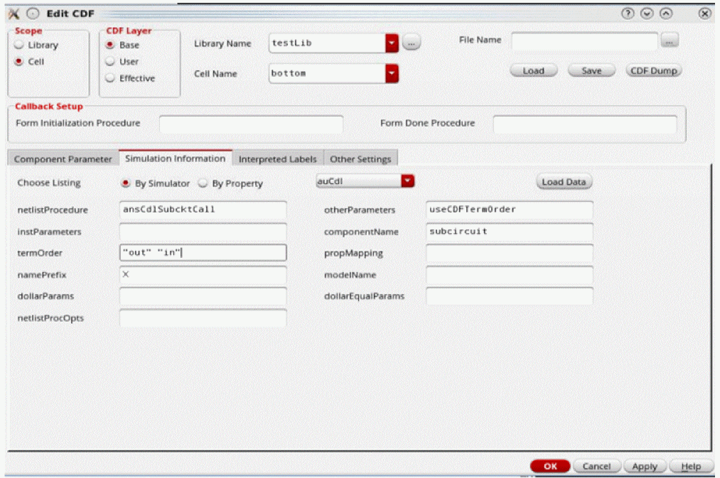 - Add the auCdl simulation information to the cell’s CDF. For more information, see CDF Simulation Information for auCdl.