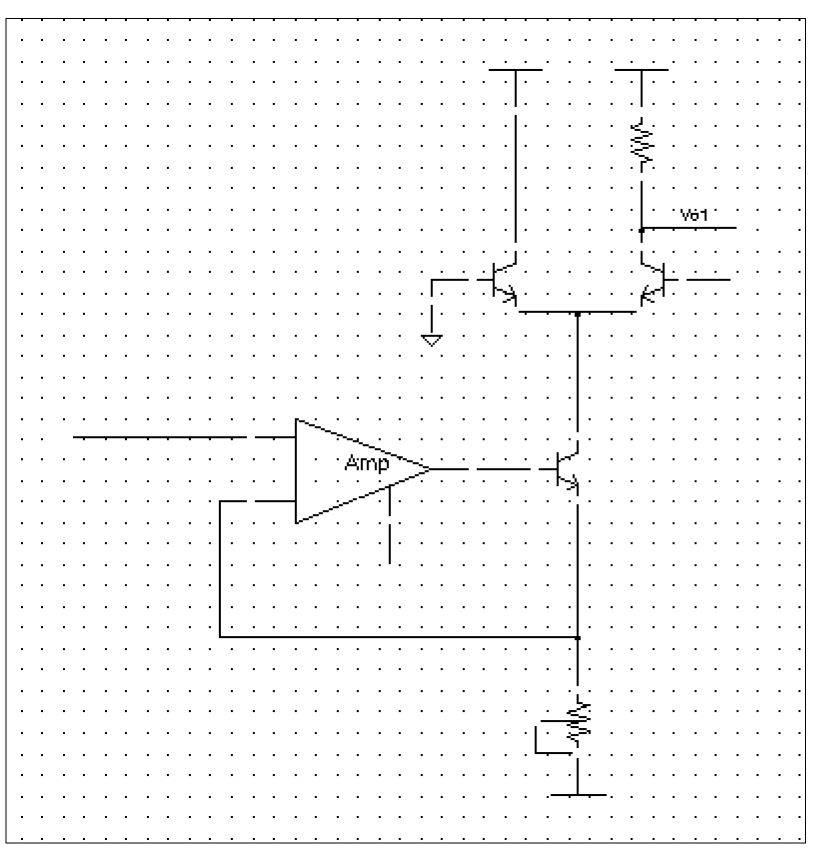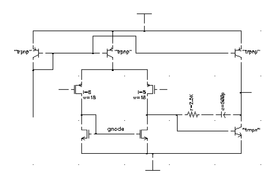 *.GLOBAL vdd! + vss! + vcc! + vee! + gnd! *.PIN vdd! *+ vss! *+ vcc! *+ vee! *+ gnd! ************************************************************** * Library Name: test_auCdl * Cell Name: amplifier * View Name: schematic ************************************************************** .SUBCKT amplifier inm inp iref out *.PININFO inm:I inp:I iref:I out:O RR0 net52 net6 2.5K $[RP] CC0 net6 out CAP $[CP] QQ0 out net52 vss! NP M=1 MM1 net52 inp net26 vdd! PM W=128e-6 L=8u M=1 MM3 gnode inm net26 vdd! PM W=128u L=8e-6 M=1 MM5 gnode gnode vss! vss! NM W=100u L=10u M=1 MM2 net52 gnode vss! vss! NM W=100u L=10u M=1 QQ4 out iref vdd! PN QQ2 iref iref vdd! PN QQ3 net26 iref vdd! PN .ENDS ************************************************************** * Library Name: test_auCdl * Cell Name: AMckt.auCdlonly * View Name: schematic ************************************************************** .SUBCKT AMckt.auCdlonly Iref Vlo Vo1 Vs *.PININFO Iref:I Vlo:I Vo1:O Vs:I XI3 net28 Vlo Iref net9 / amplifier QQ2 net15 net9 net28 NP M=1.0 QQ1 vcc! gnd! net15 NP M=1.0 QQ0 Vo1 Vs net15 NP M=1.0 RR0 vcc! Vo1 10e3 $[RP] RR1 net28 vee! 4e3 $SUB=vee! $[RP] .ENDS