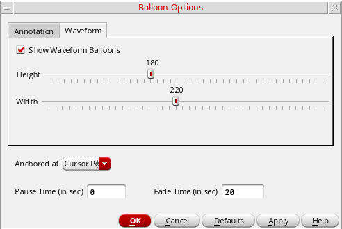 In this form, click the Waveform tab and then select the following options to display, hide, and resize the waveform info-balloons: