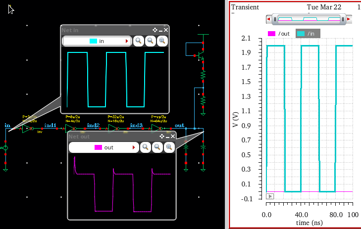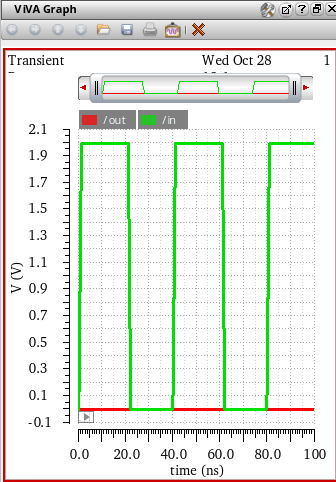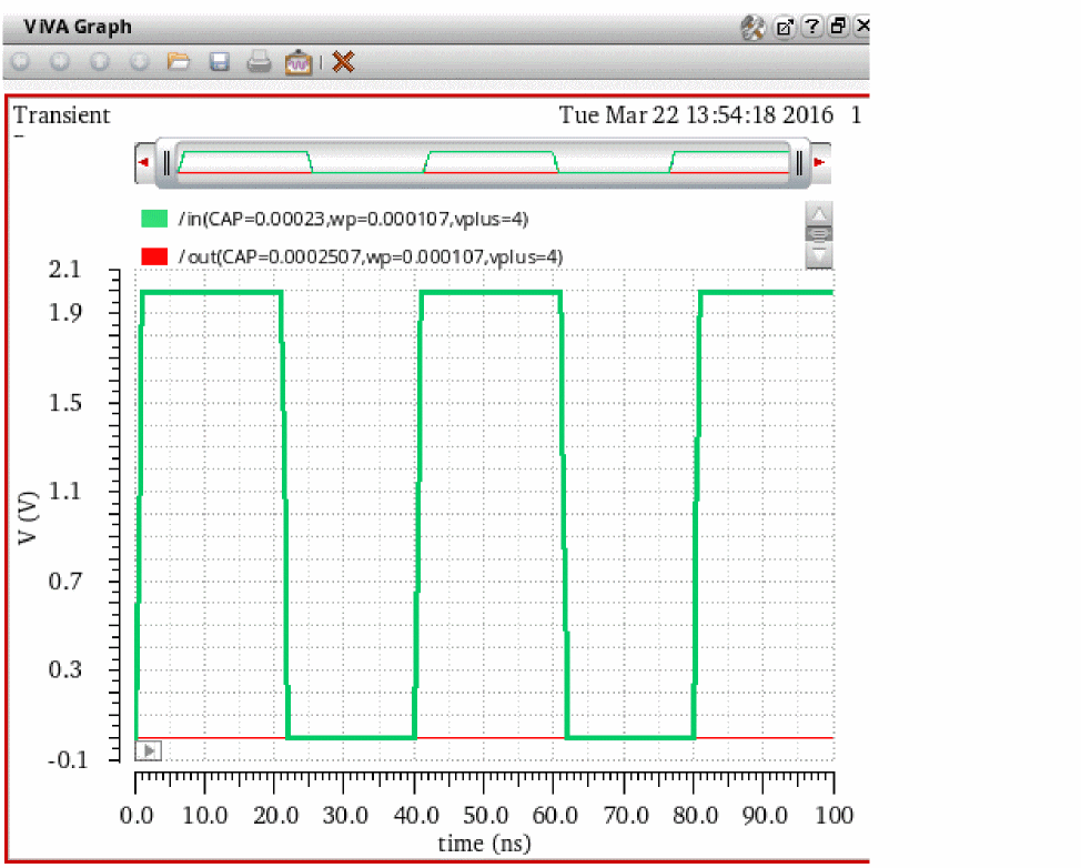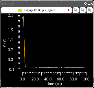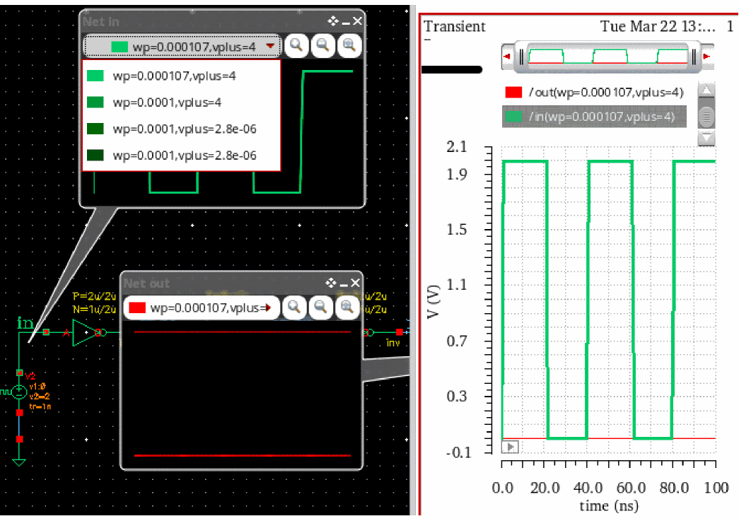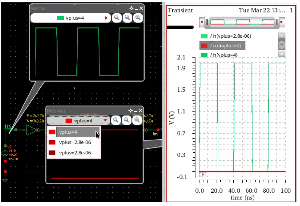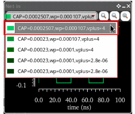 Notice that the color of waveforms from the previous runs becomes dimmer every time when a new simulation is run. The waveform with the brightest color indicates the latest plot. Alternatively, you can set the dimSameColor environment variable to nil to display these waveforms in different colors. The default value of this variable is t.