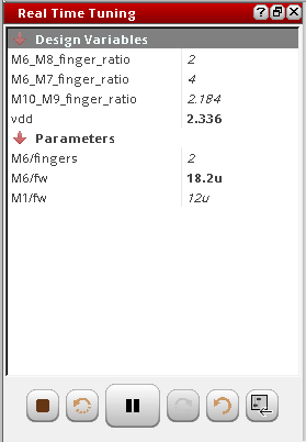 The Real-Time Tuning pane opens as a dockable assistant in schematic and Explorer. By default, when you launch this assistant, it is displayed on the schematic tab. You can click the maestro tab to view this assistant in ADE Explorer.