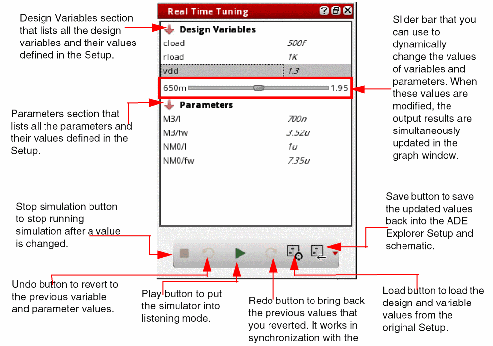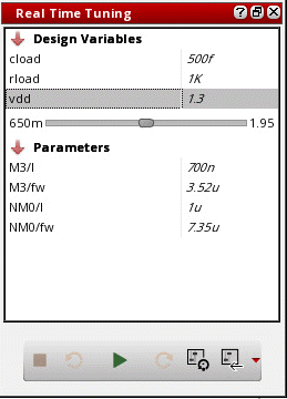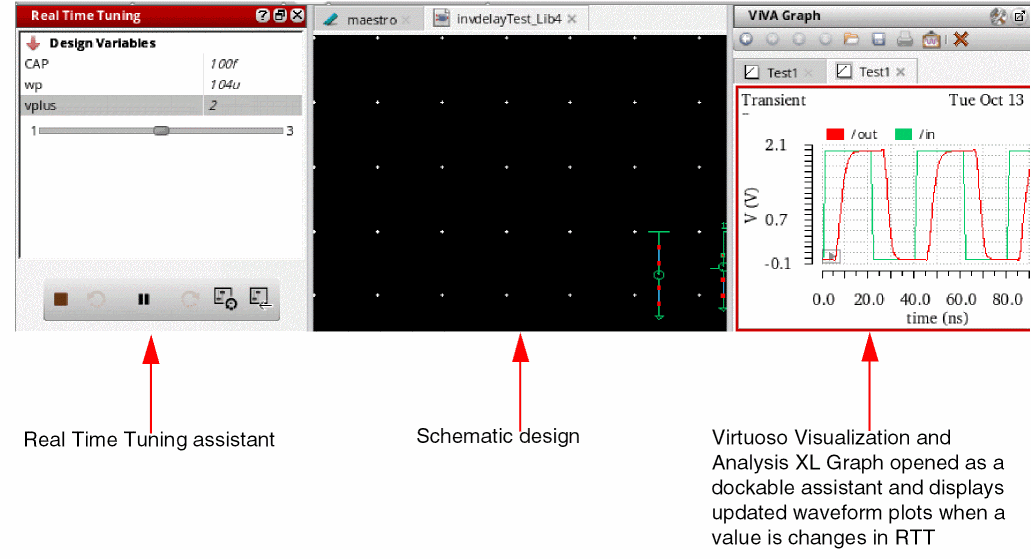 When you use Spectre from MMSIM14.1ISR3 release or onwards (with or without APS mode enabled), the RTT assistant works in the interactive mode. The netlist and full simulation run take place only for the first time when you click the Play button. After that when you change the parameter or variable values in the assistant, the instant simulation run takes place and the corresponding output waveforms are simultaneously updated in the ViVA XL Graph assistant or in the waveform info-balloons on schematic.