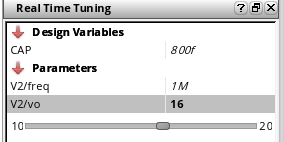 If the parameter you are tuning is a sweep parameter, then the minimum and maximum values are displayed at the two ends of the slider bar and you can move the slider to select values based on the specified step size. For example, in the below figure, for parameterV2/vo, the sweep defined is10:2:20. The slider bar shows minimum value as10, maximum value as20, and you can specify only values that are at the interval of2, such as 12, 14, 16, 18. The maximum of 100 points (step values) can be selected through the slider.