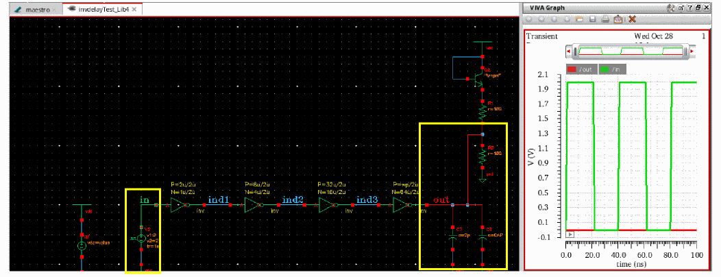 The nets in the schematic are displayed in the same color as that of the waveform plots in the graph window. See the yellow highlights in the figure below.
