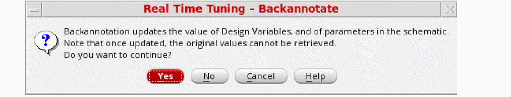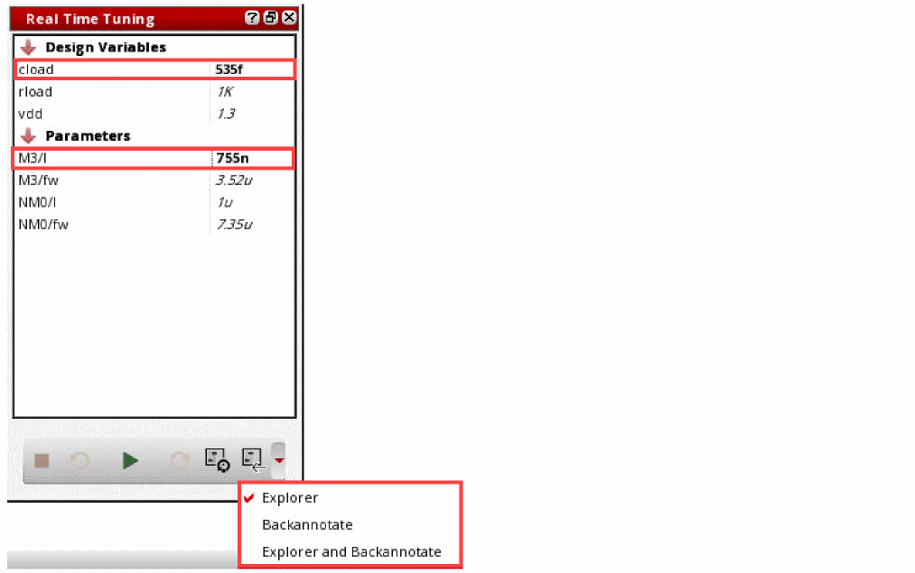 Explorer and Backannotate: Updates the values of the design variables and parameters in the setup assistant, and that of parameters in the schematic.You can control the default selection by setting the value of the environment variable, saveToMode.