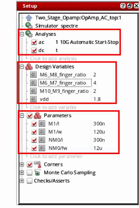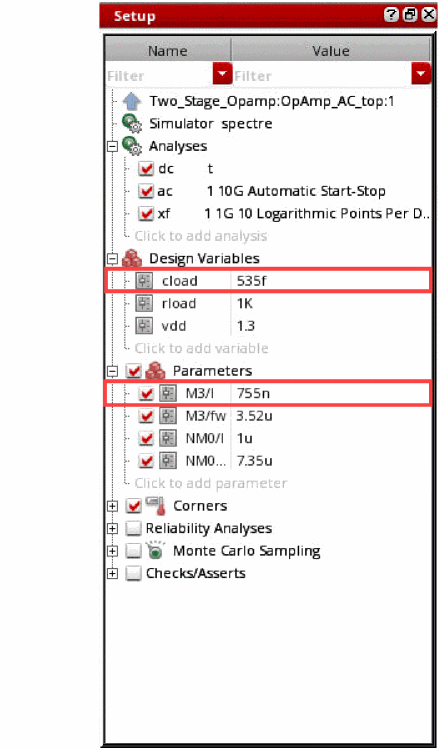 Consider the setup shown in the figure below in which you define the AC and DC analyses, four design variables and four parameters: