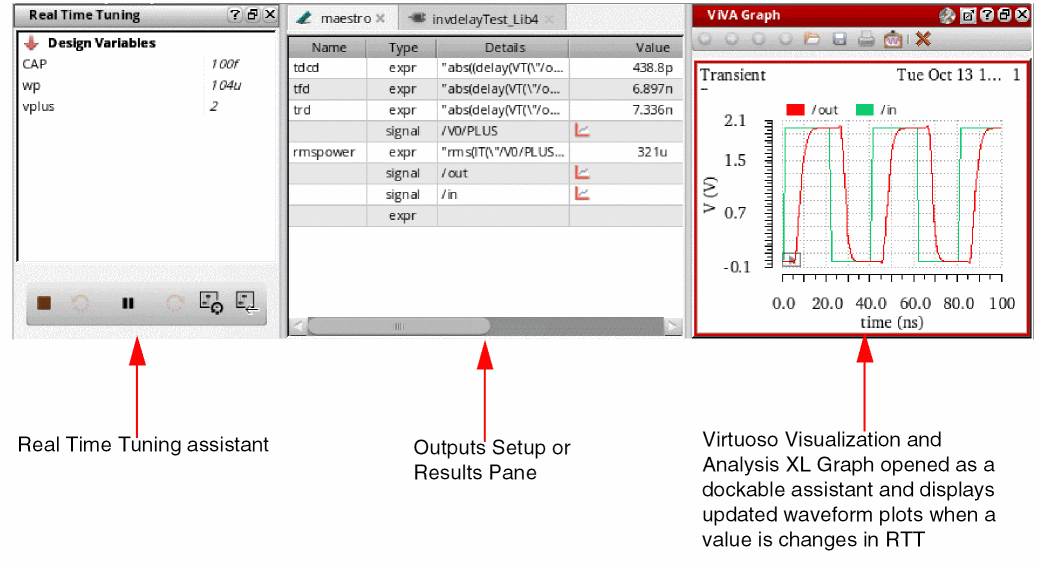 The Real-Time Tuning (RTT) assistant in ADE Explorer helps you edit the values of variables and parameters and the simulation results are dynamically updated to reflect the changes that have been made. In this mode, you can run the simulation once and fine-tune your results later by changing the variable values and simultaneously viewing the updated results. The output waveforms are displayed in the Virtuoso Visualization and Analysis XL graph window that can also open up as an assistant in ADE Explorer and displayed to the right of the ADE Explorer or design window. The output waveforms are updated as soon as you change the parameter values in the RTT assistant. You can also change the plotting mode to control the display of waveforms or compare waveforms generated after changing variable and parameter values. The available plotting modes are append, replace, new window, and new subwindow.