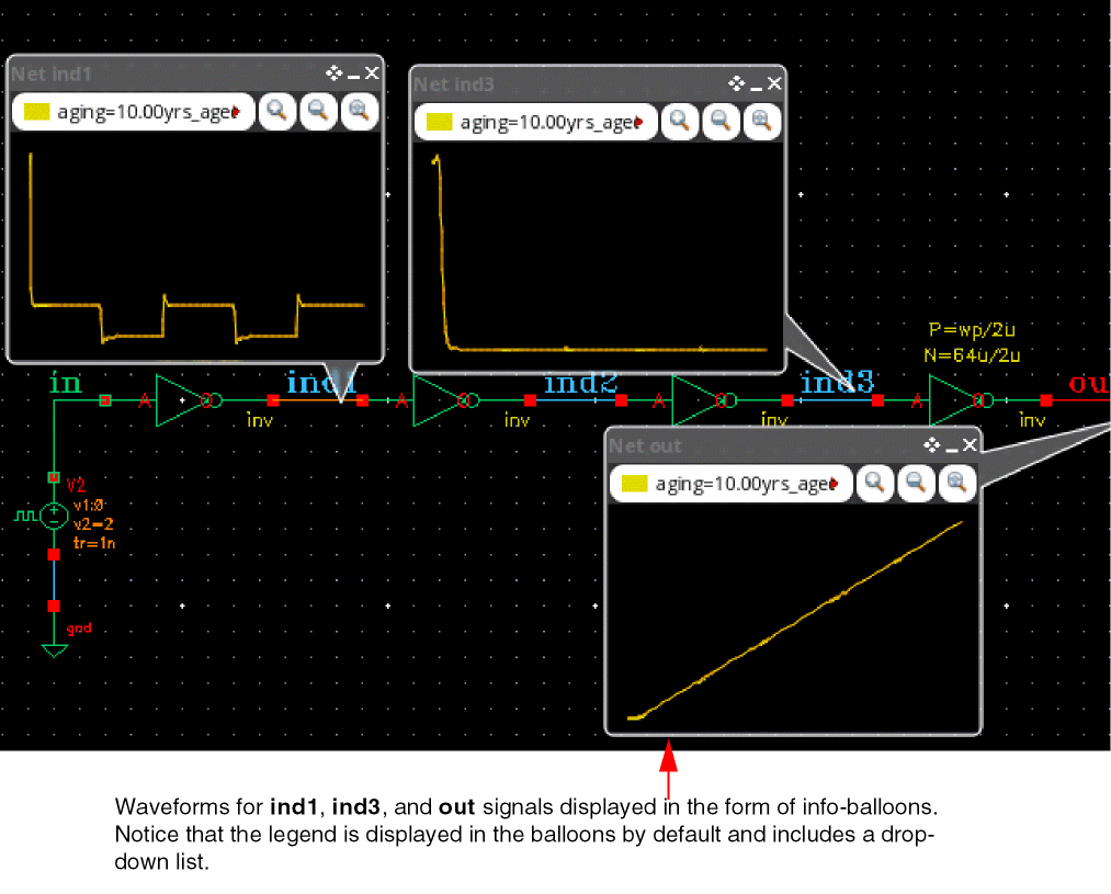 Notice that info-balloons in the above figure display a drop-down for the legend inside the trace. This drop-down includes a list of waveforms generated for the sweep values for each leaf. When the simulation includes sweep variables, the legend drop-down displays a list of waveforms generated for all sweep values. This drop-down also maintains a history of waveforms generated for the previous simulation runs.