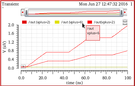 The color of waveforms in the info-balloon is same as that displayed in the ViVA Graph assistant. Also, if you select a waveform in the info-balloon, the same waveform is highlighted in the ViVA Graph assistant. For example, in the above figure, the out signal at vplus=4 is highlighted in the waveform info-balloon and ViVA Graph assistant.