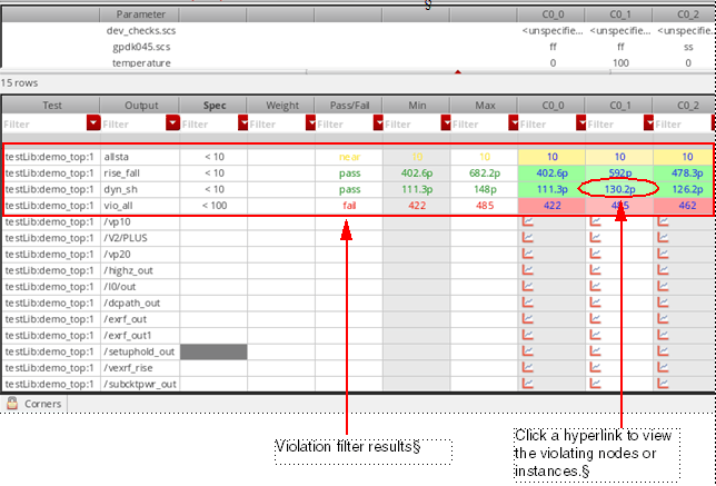The violation filter output value for each corner is a hyperlink. Click any value with hyperlinks to display the detailed results that contributed to this value. The net- or instance-wise details are opened in Checks/Asserts results view. With an aim to resolve violations, you can use the hyperlinks in that detailed view, find the violating nodes or instances, waive violations, and add comments.