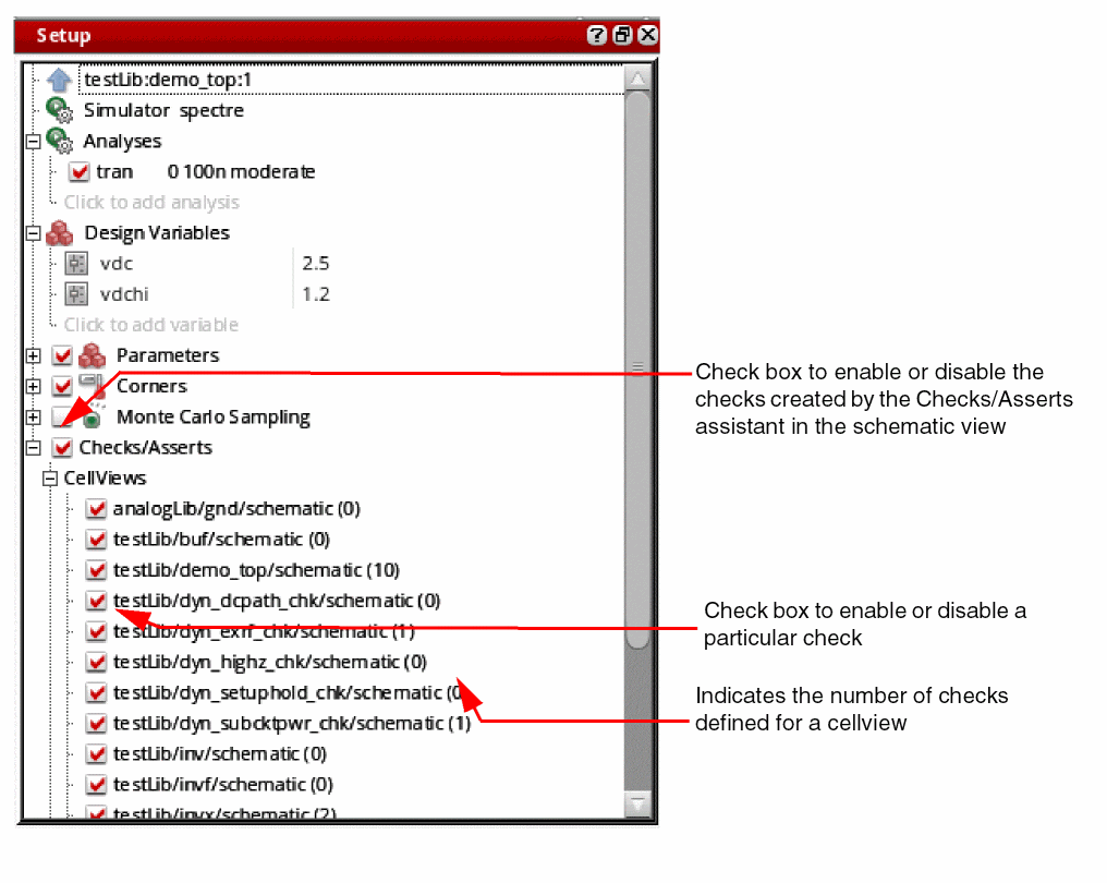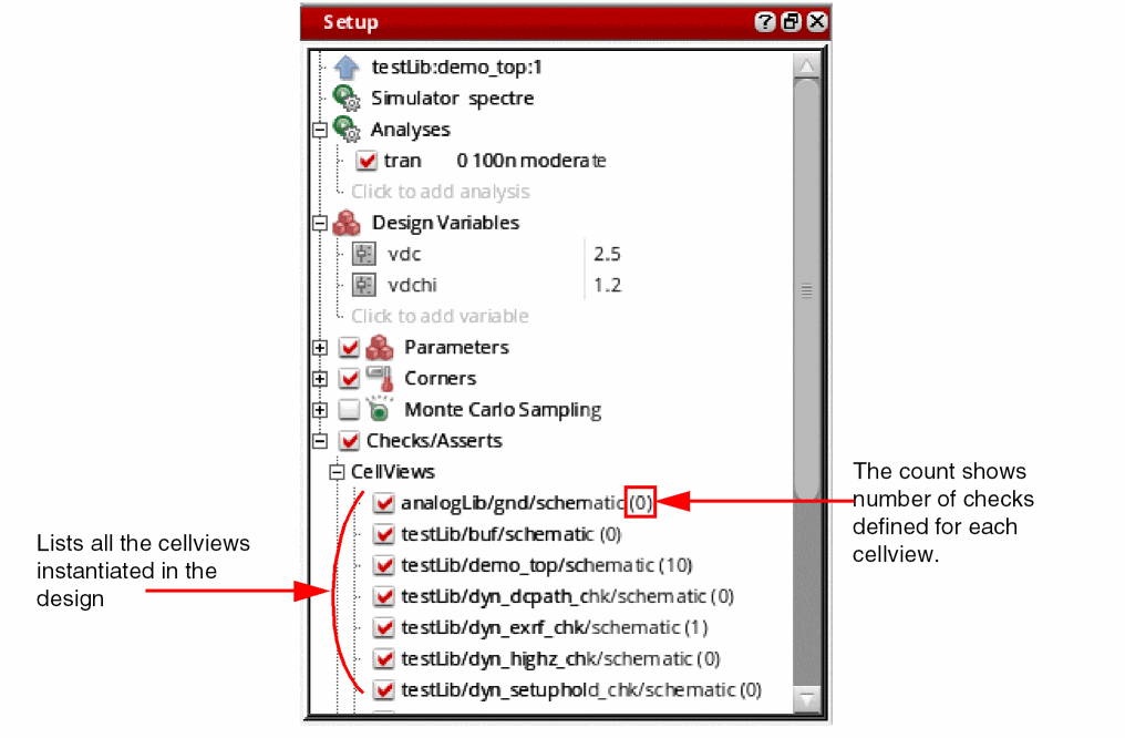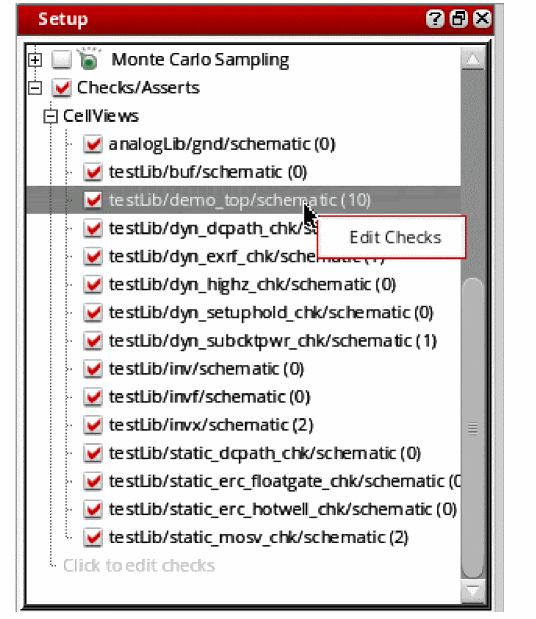 The Checks/Asserts tree in the Setup assistant shows the cellviews for which checks and asserts have been defined. By default, this check box is disabled.