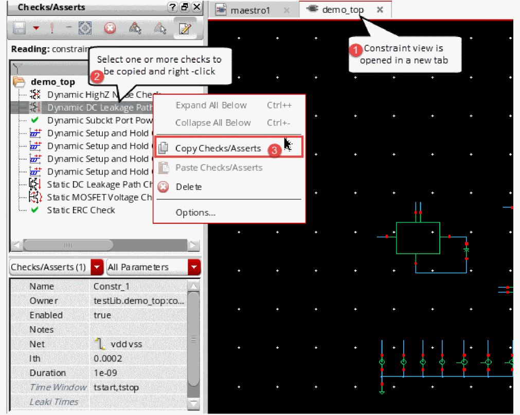 - The constraint view of the target cellview is also opened in a new tab and the Checks/Asserts assistant is displayed