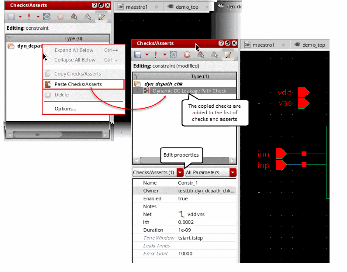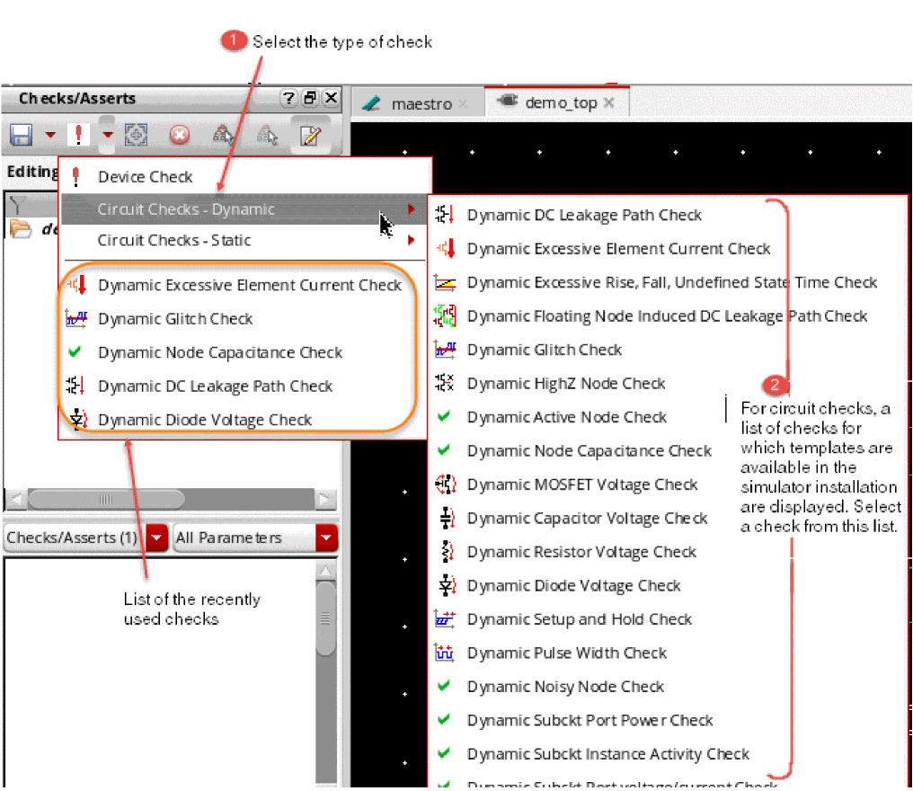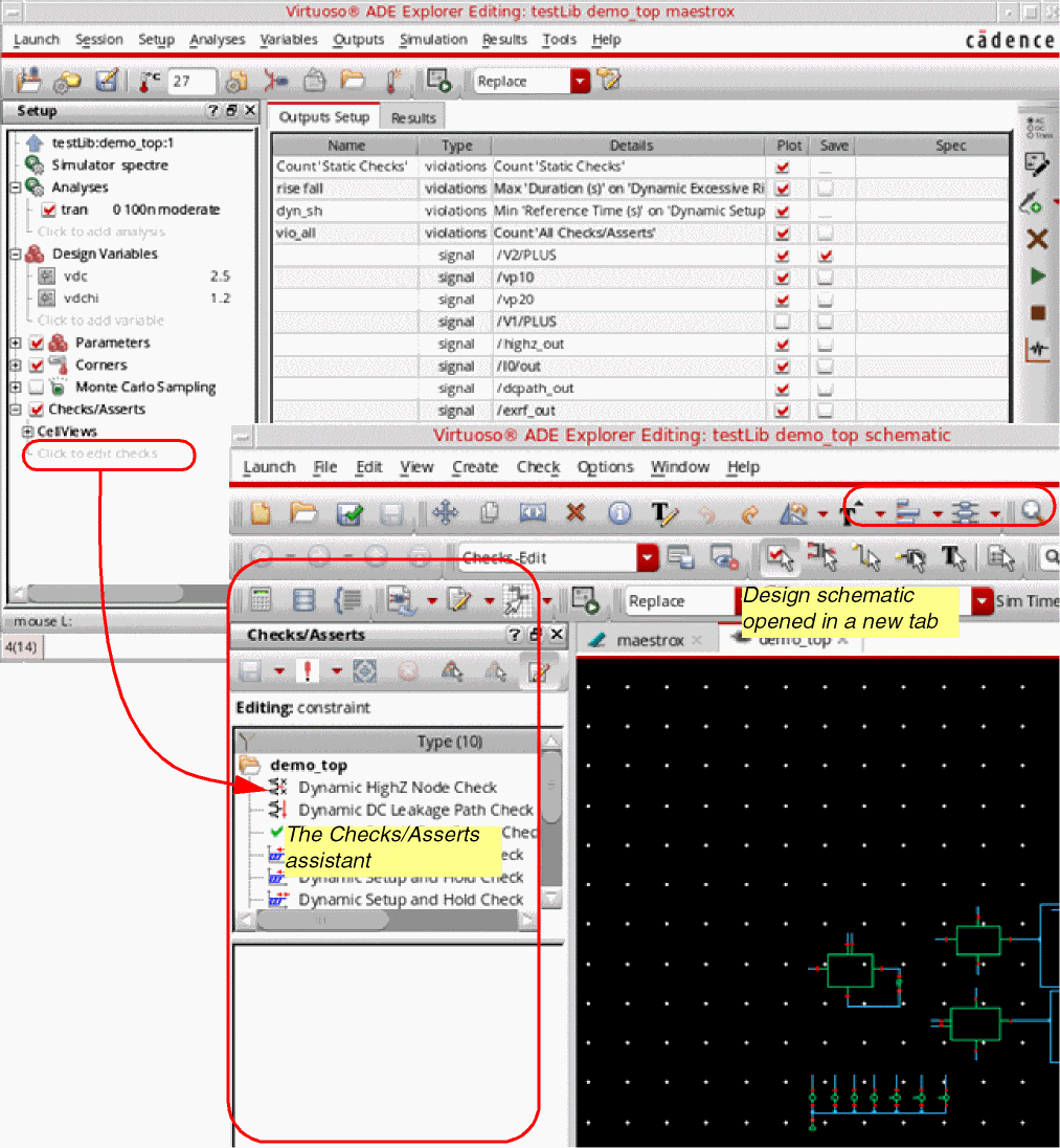 - By using the Checks/Asserts assistant in the Virtuoso Schematic Editor window