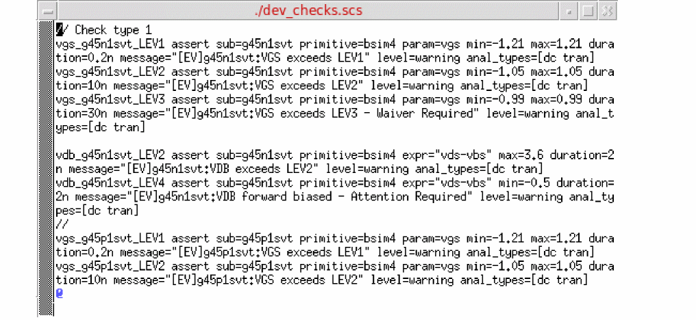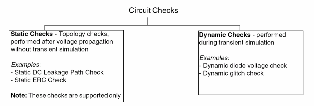 Checks (or circuit checks) enable you to analyze typical design problems, such as high impedance nodes, leakage paths between power supplies, setup and hold timing errors, power issues, connectivity problems, or extreme rise and fall times.