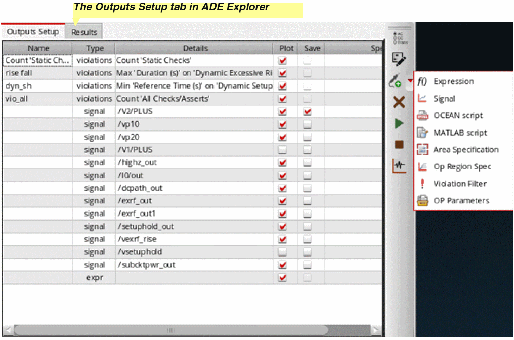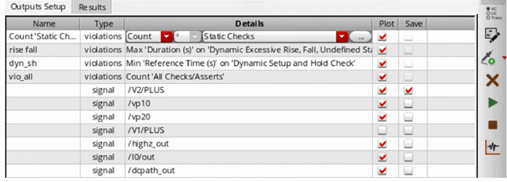 In ADE Explorer, you can perform all the circuit and device checks that are supported by the MMSIM 14.1 ISR11 or later releases. The checks should be defined using the required syntax and keywords, and can include wildcards, subcircuits, and instance scoping. Spectre writes the results of these checks into the SQLite database in XML format. ADE Explorer reads that data and displays it in tabular format on the Results tab.