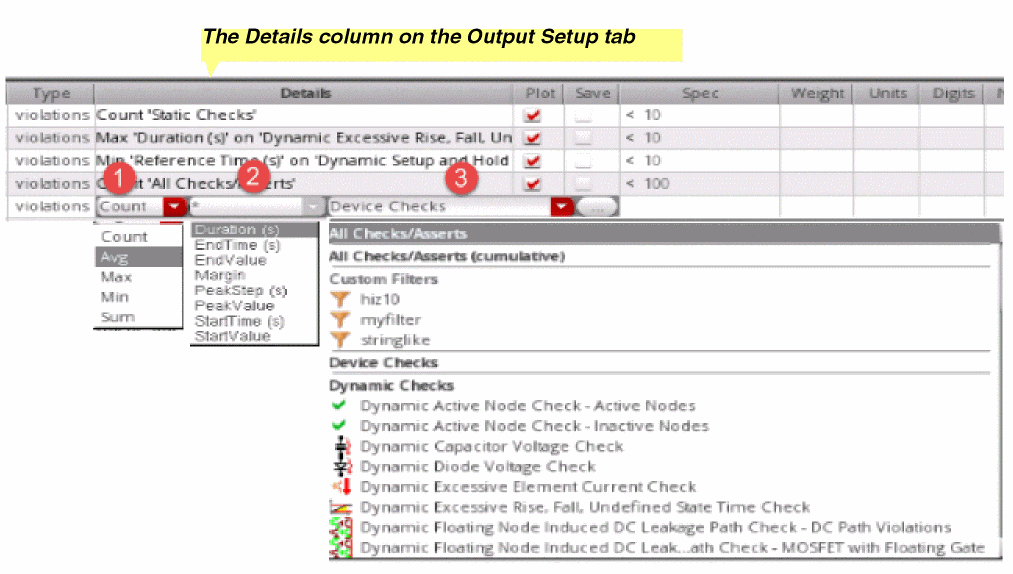 After adding checks in the Checks/Asserts assistant and defining violation filters in the Outputs Setup pane, you can run a simulation to run the checks on the simulation results. The Detail results view shows a consolidated report of the violation filter expressions defined in the Output Setup tab. For example, Count will report the number of violations of the specified type.