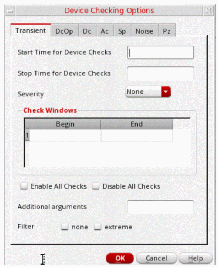 - Start Time for Device Checks—Specify the beginning time at which device checks are to be enabled or disabled for transient analyses.