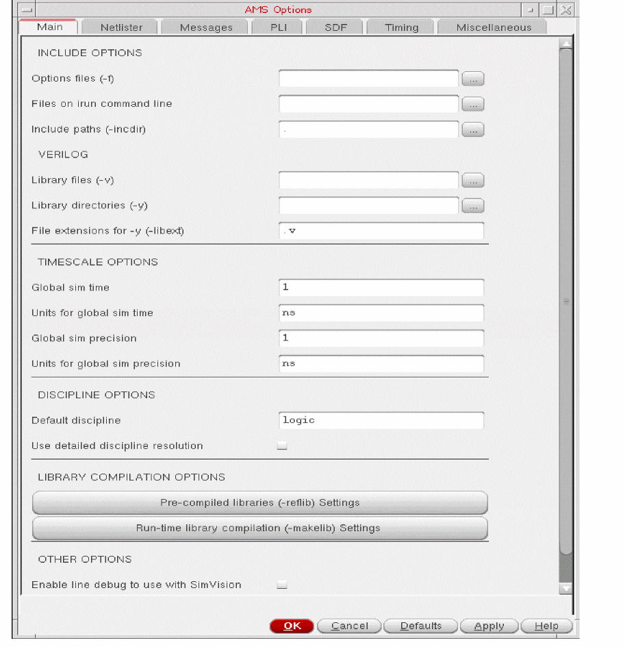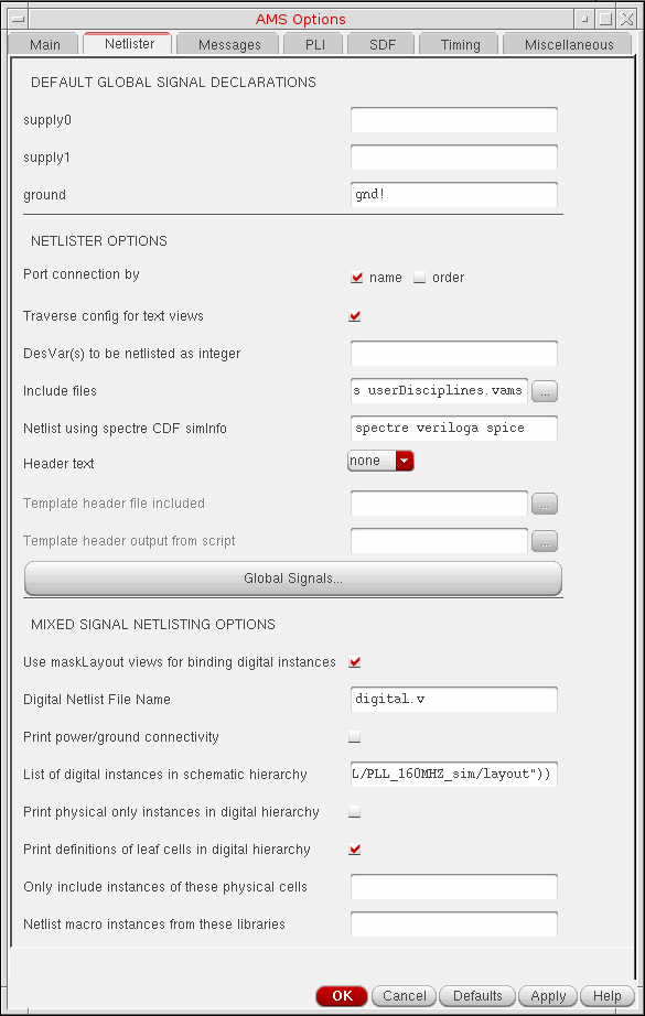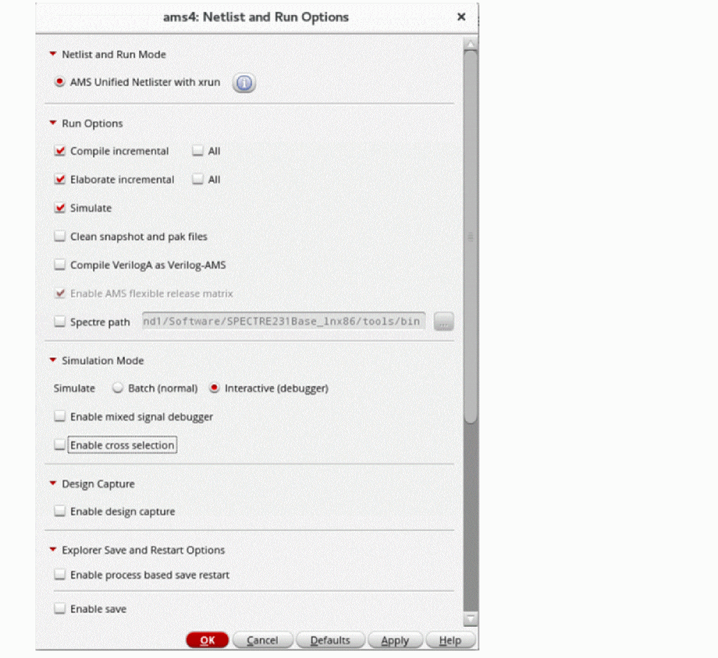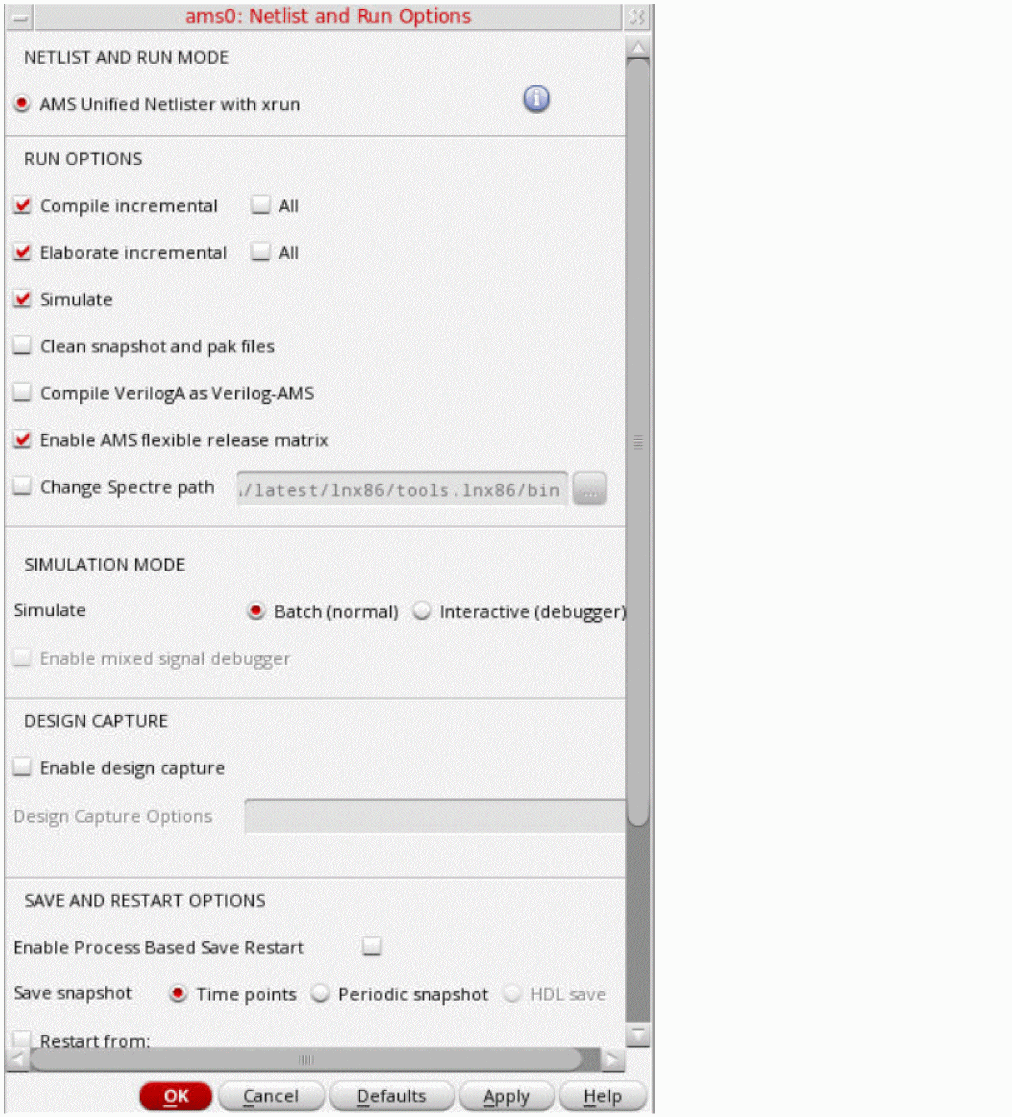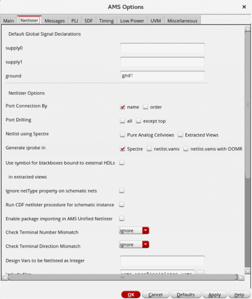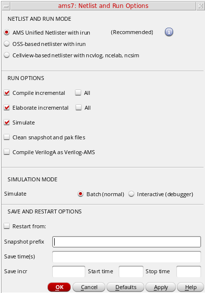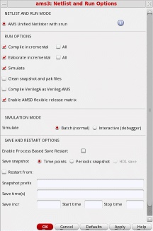 You can set AMS netlister and simulation run options by choosing Simulation – Netlist and Run Options. This brings up the Netlister And Run Options form.