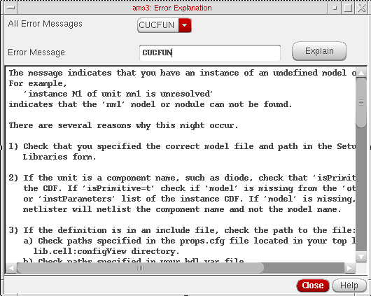 You can view detailed explanation of the error for AMS in the Error Explanation form. Choose Simulation – Output Log – Error Explanation to launch the Error Explanation form.