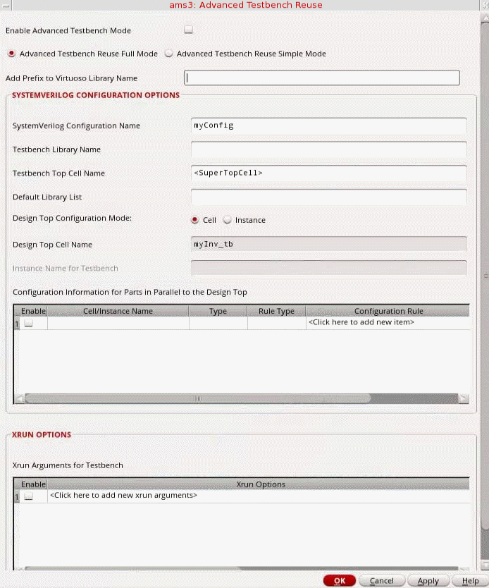To simulate your design with AMS Designer in ADE Explorer or ADE Assembler, you must specify a top-level config cellview for your design hierarchy. The design can contain other config cellviews at lower levels in the hierarchy. See Creating a Configuration Cellview for information on how to create a config view