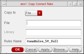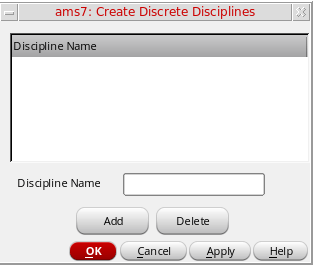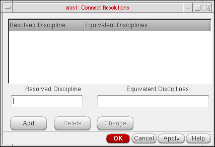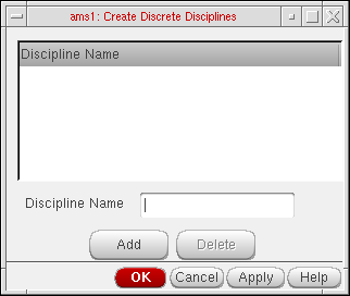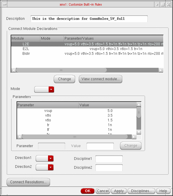 After copying over disciplines from a cellview, when you click the Discipline button, a form may pop up listing the disciplines that have not been defined and asking if you would like to define them. If you select Yes, the Create Discrete Disciplines form appears showing a list of the undefined disciplines. If you select No, it appears blank. - You can specify connect rules for a selected discipline by using the Connect Rules button to bring up the Select Connect Rules form. You can use this form to create, modify or delete connect rules. This form appears only if ADE Explorer is up and the simulator set to ams. Otherwise, an error message appears.