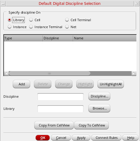 To copy disciplines from the cellview, click the Copy from Cellview button. Conversely, to copy disciplines from the form to the cellview, click the Copy to Cellview button.
