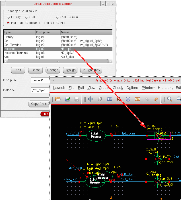 You can specify disciplines on a library, cell, cell terminal, instance, instance terminal and net from the Composer UI. You can autocreate a discrete discipline and Explorer auto-compiles the discipline for you. For more information, see Default Digital Discipline Selection. -