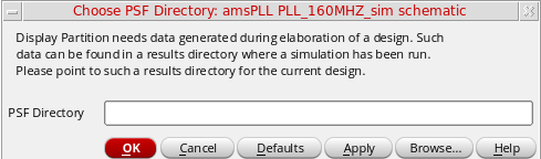 However, if you do not run the simulation, the Choose PSF Directory form is displayed, as shown below. On this form, type the path to the simulation data directory in the PSF Directory field, or select the results using the Browse button.