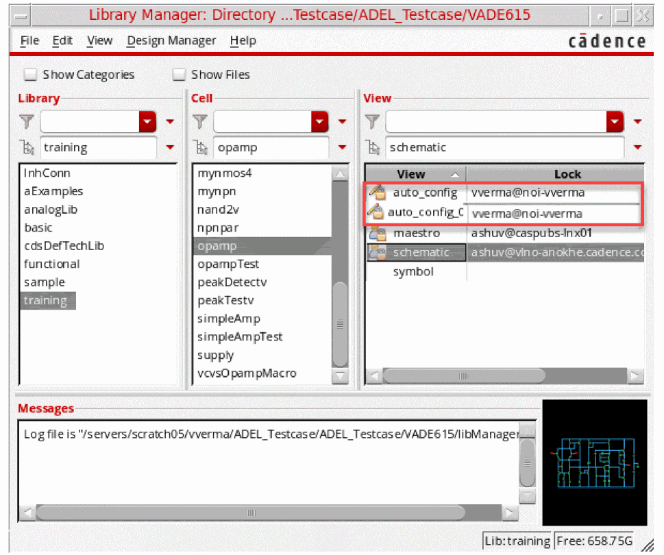 auto_config. However, you can specify a different name for this cellview using the autoConfigNameForConfigCreation environment variable.If you try to create a new cellview automatically when the cellviewauto_configalready exists, it creates a new cellviewauto_config_0. Theseauto_configcellviews are created incrementally. The added cellviews can be seen in the View column of Library Manager.