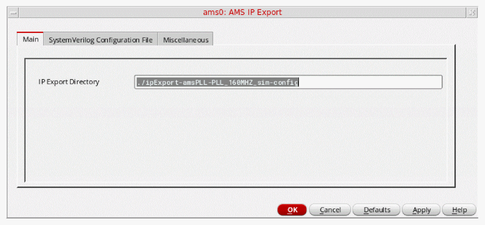 While setting this command, it is assumed that the Virtuoso IP would be instantiated into a larger digital testbench, as specified by the digital testbench and Verilog config scope export settings defined in the Virtuoso ADE forms.runams -lib zambezi45_sim -cell pll_sim -view maestro -netlist all -clean -cdslib /home/user1/cds.lib -rundir /home/user1/runams_export_rundir -export -log runams_export.log